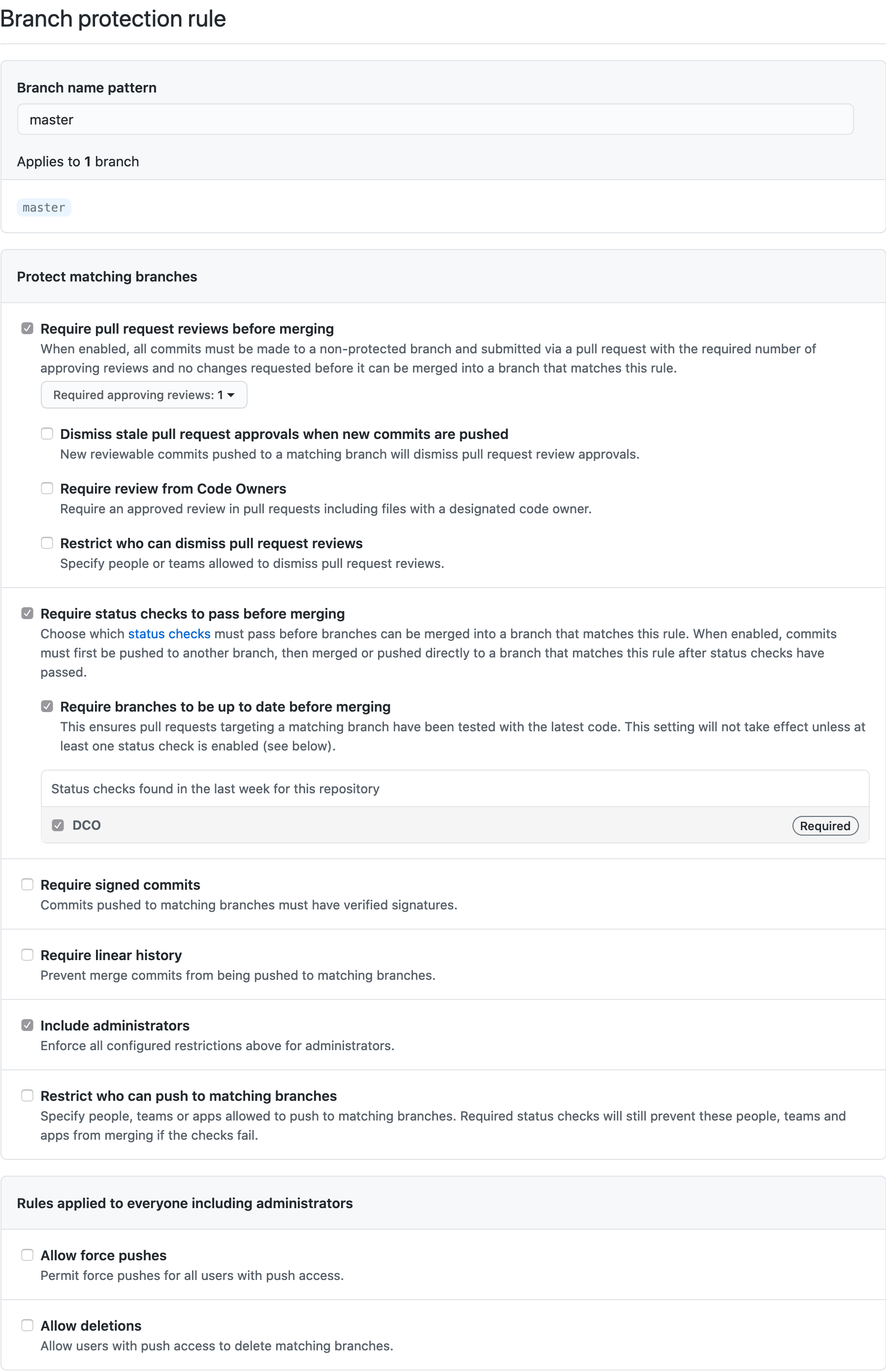 By default, all GitHub repositories have both the GitHub DCO App installed and commit signoffs enabled. DCO guidelines for hosted projects are outlined in the contributing guidelines.